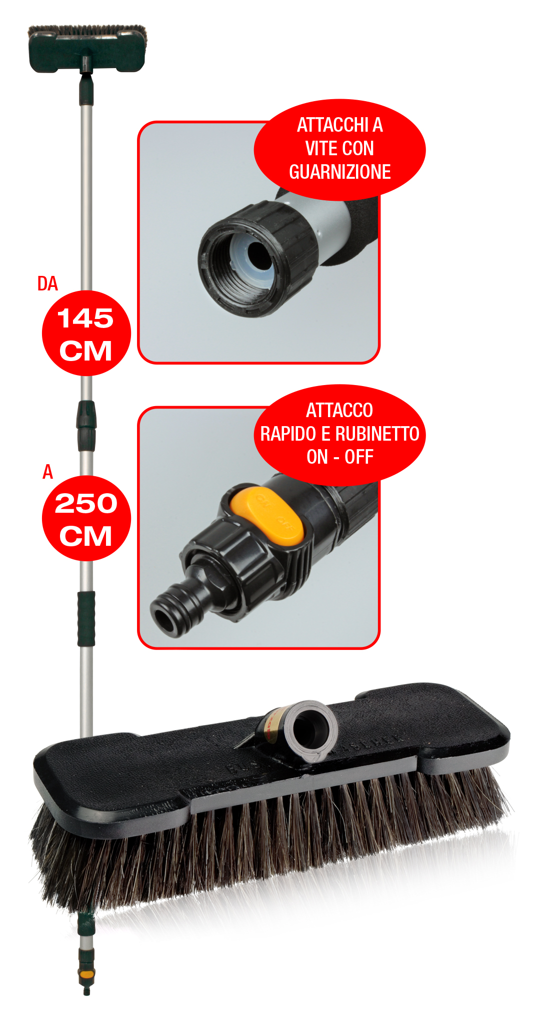 Il manico telescopico in leggero ma resistente alluminio è proposto da Ippa. Allungabile da 145 cm a 250 cm, permette di arrivare a pulire fino a 4 metri d'altezza in totale sicurezza.