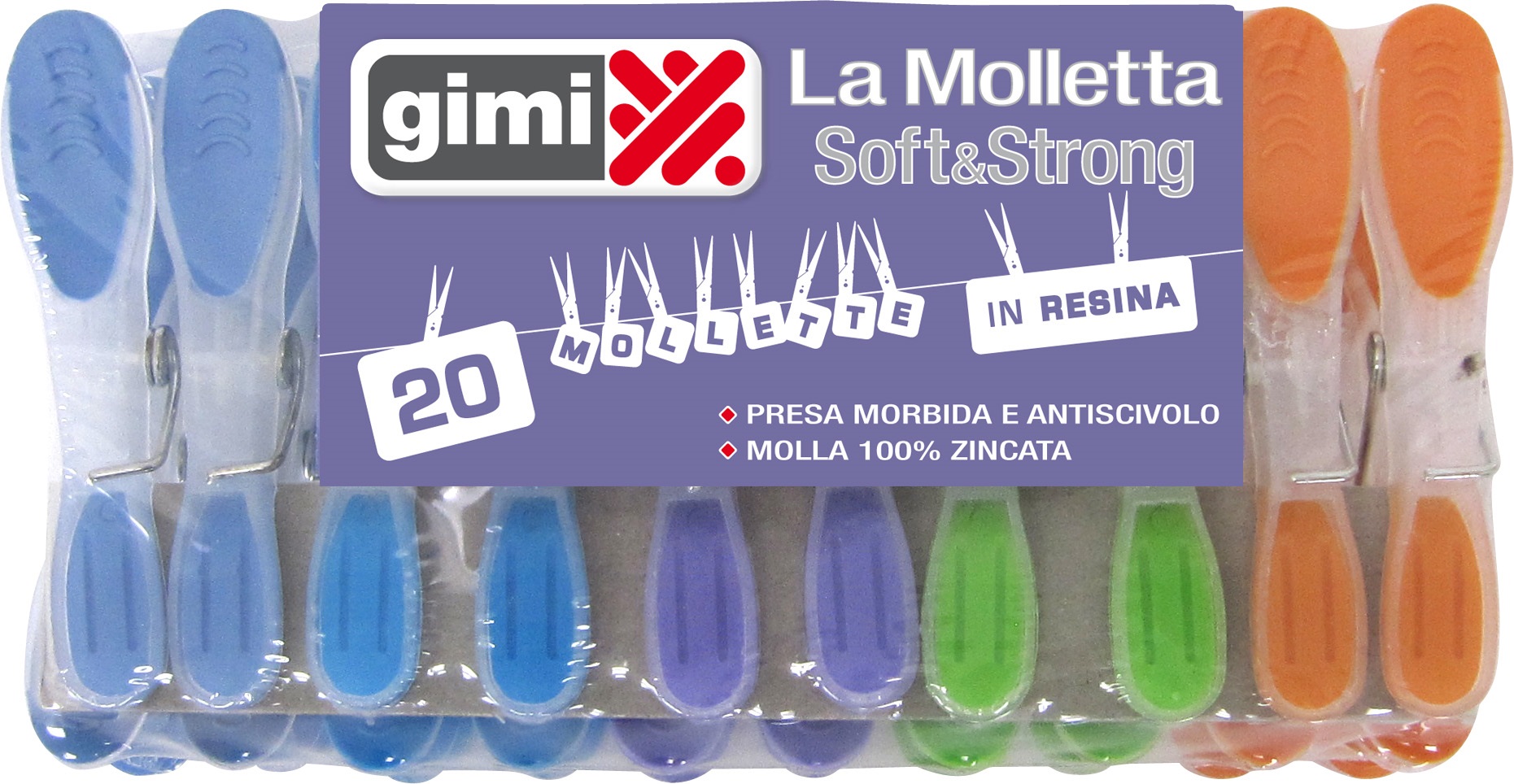 Le mollette multiuso Soft&Strong di Gimi sono realizzate in resina colorata e assicurano una presa morbida e antiscivolo. Particolarmente resistenti e maneggevoli, sono proposte in un pack da 20 mollette in 5 tonalità differenti: arancione, verde, lilla, celeste e azzurro. Molla zincata antiruggine.