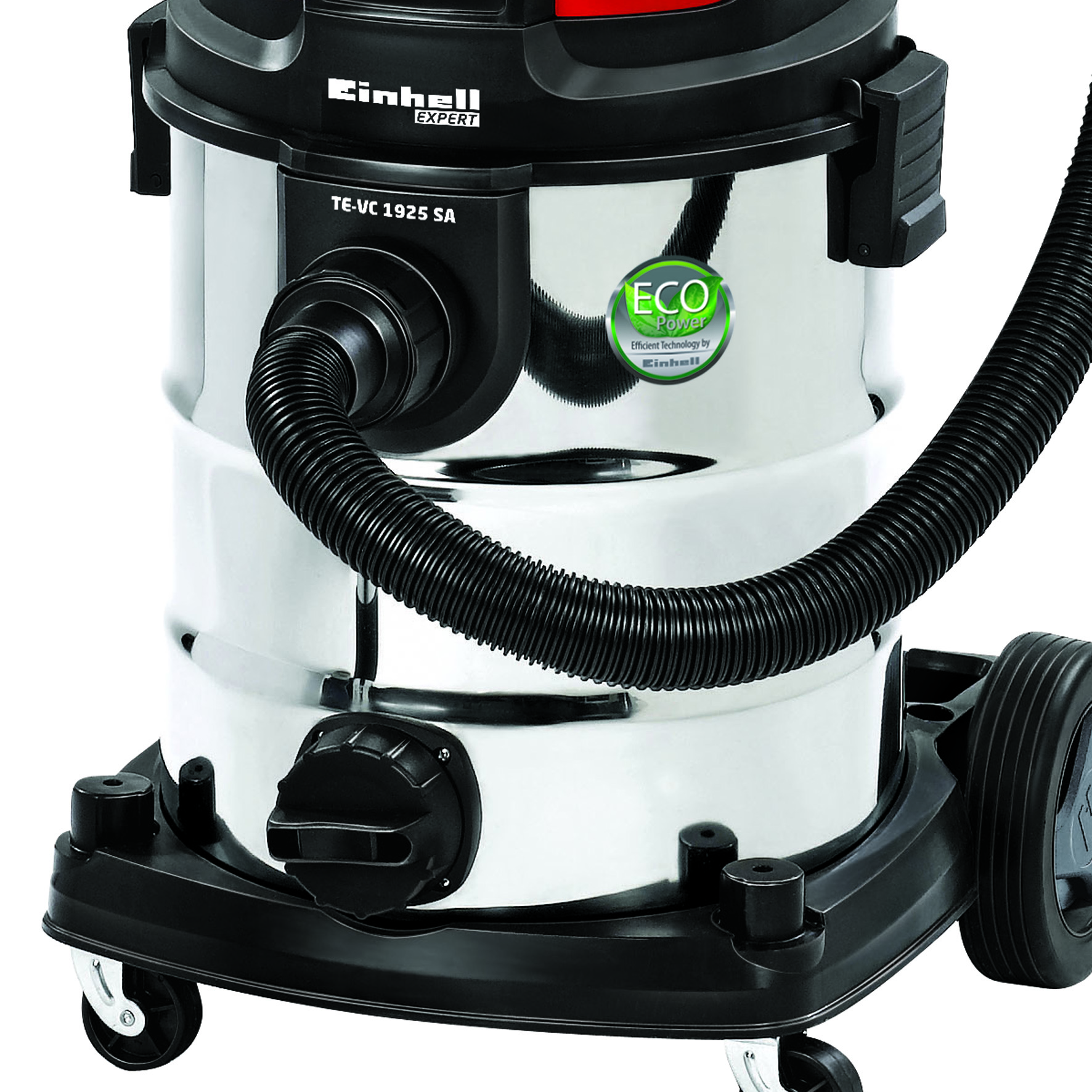 All’interno della gamma a cavo di aspiratori di Einhell è presente il bidone aspiratutto TE-VC 1925 SA, un aspiratore con sistema Eco-Power, che assieme al motore Bi-turbo garantisce il silenzio e il consumo del 50% in meno dell’energia elettrica. Il sistema a 2 vie per l’aria di scarico e l’aria di raffreddamento riducono lo stress sul motore, rendendo l’aspirapolvere una soluzione ideale sia per i materiali solidi sia per quelli liquidi. Il modello viene fornito con un tubo flessibile di aspirazione da 3 metri, un braccio telescopico di aspirazione in acciaio inox, ugelli adatti a diversi usi ed è dotato di presa elettroutensile. Le rotelle garantiscono un rapido spostamento.