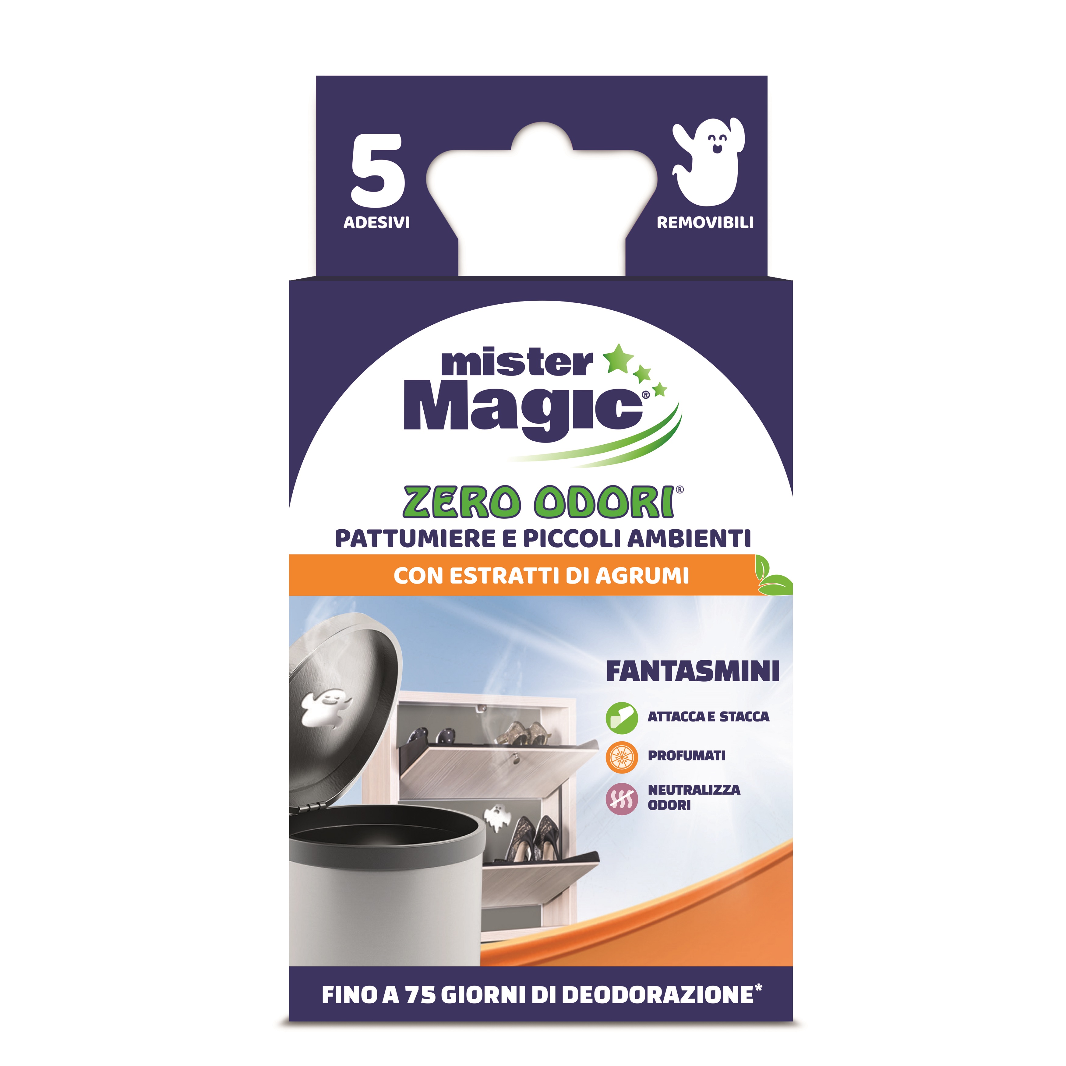 La scarpiera e il bidoncino della pattumiera sono punti critici per i cattivi odori in casa. L’impegno a tenere sempre tutto pulito e ordinato richiede comunque anche un piccolo aiuto: Zero Odori Mister Magic® per Pattumiere e Piccoli Ambienti in un attimo neutralizza i cattivi odori… anche nei ripostigli o nei sottolavelli e in ogni ambiente ristretto.