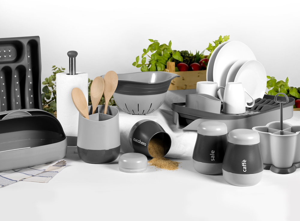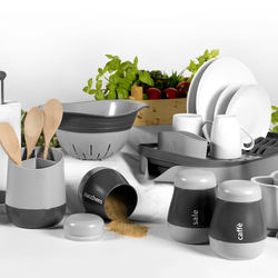 La gamma si compone di: set 3 barattoli 900 cc (art. 8600800); portapane con chiusura a scorrimento (art. 8600900); colapasta 24 cm (art. 8601000); portarotolo (art. 8601100); portautensili a 3 scomparti (art. 8601300); portaposate a 6 scomparti (art. 8601500); scolaposate a 4 scomparti (art. 8601200); scolapiatti (art. 8601400).