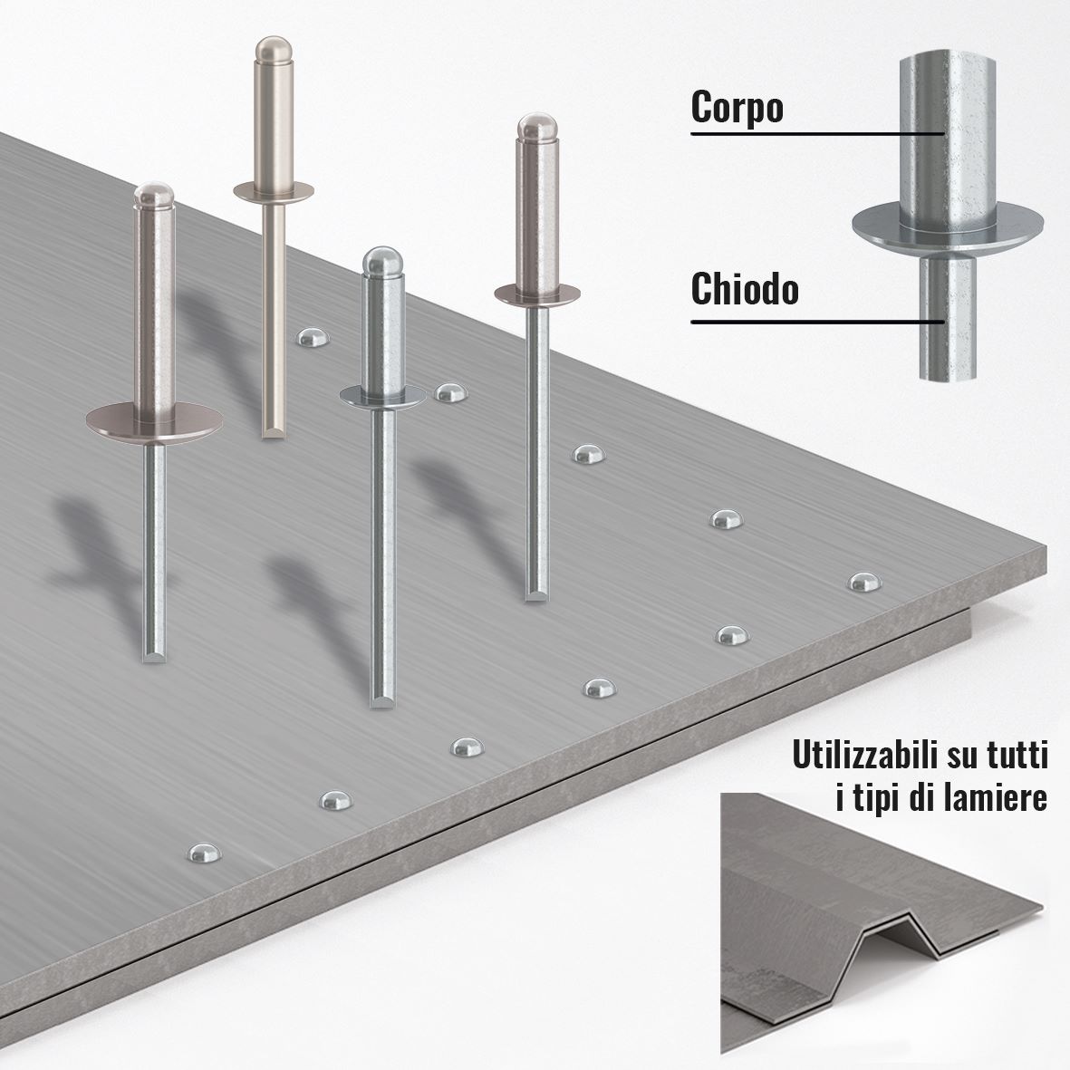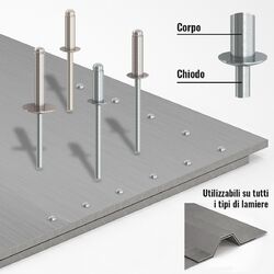 Ambrovit propone quattro tipologie di rivetti a strappo con differenti misure e finiture: acciaio Inox A2, acciaio zincato Cr3 o in combinazione acciaio zincato Cr3/Alluminio.