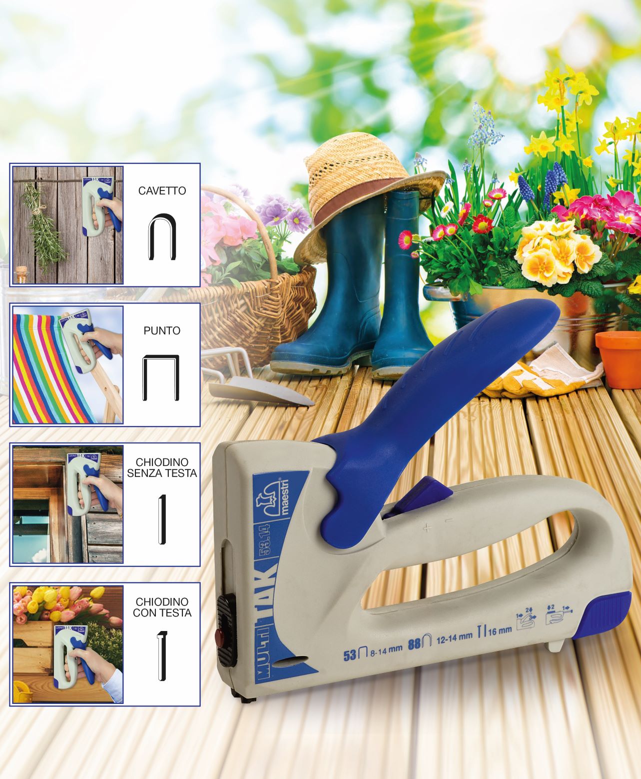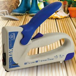 Multitak di Romeo Maestri è una fissatrice manuale compatta e maneggevole che utilizza sia punti metallici sia chiodini. Ideale per tutti i lavori di fissaggio, decorazione, tappezzeria, falegnameria e vetrinistica.