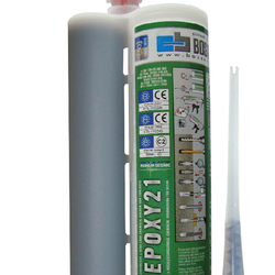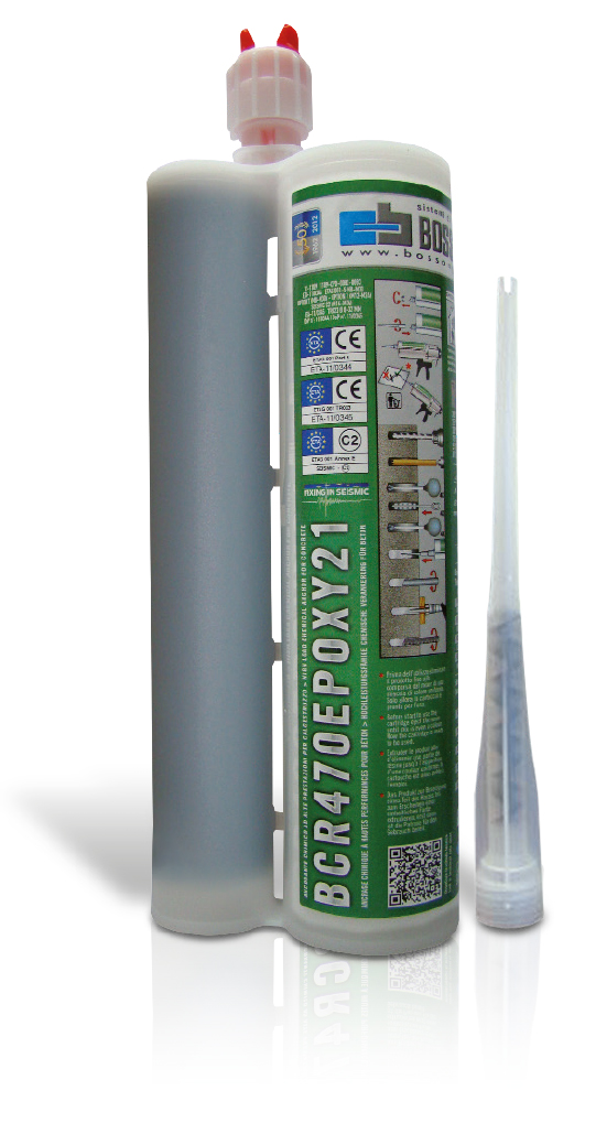 EPOXY 21 di Bossong è una resina epossidica bi-componente ad alto valore di aderenza per fissaggi pesanti per applicazioni su calcestruzzo, muratura piena e legno. Doppia marcatura CE qualificata anche per azioni sismiche categoria C2. Omologazioni valide per un’ampia gamma di barre filettate e di barre ad aderenza migliorata. Utilizzabile con calcestruzzo umido o in foro allagato senza raddoppiare i tempi per la messa in carico. Opzione 7 da M8 a M30 per calcestruzzo non fessurato e Opzione 1 per installazione in calcestruzzo fessurato con barre da M12 a M24. Omologato per fissaggi con profondità variabile di ancoraggio.