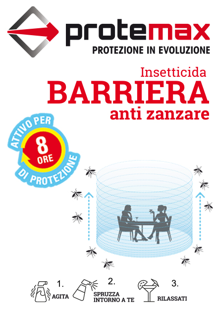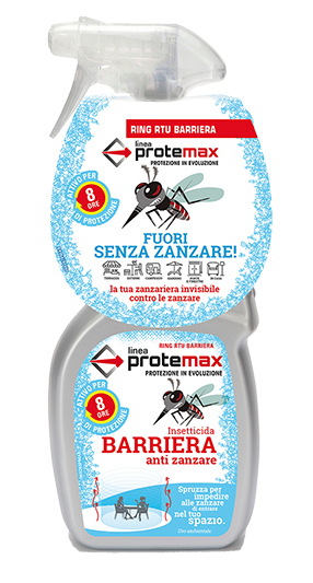 Protemax Barriera crea una una zanzariera invisibile, da attivare semplicemente spruzzando il prodotto nell’ambiente intorno allo spazio da difendere (il portico, in giardino, sui davanzali, sulle porte), in modo che la sostanza contenuta (transflutrina) si attivi immediatamente evaporando in modo costante e duraturo per 8 ore.