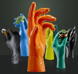 I modelli 393040 e 393044, arancioni, sono monouso e ambidestri, completamente latex-free, con finitura esterna a squama di pesce e con spessore sul palmo di 0,15 mm.