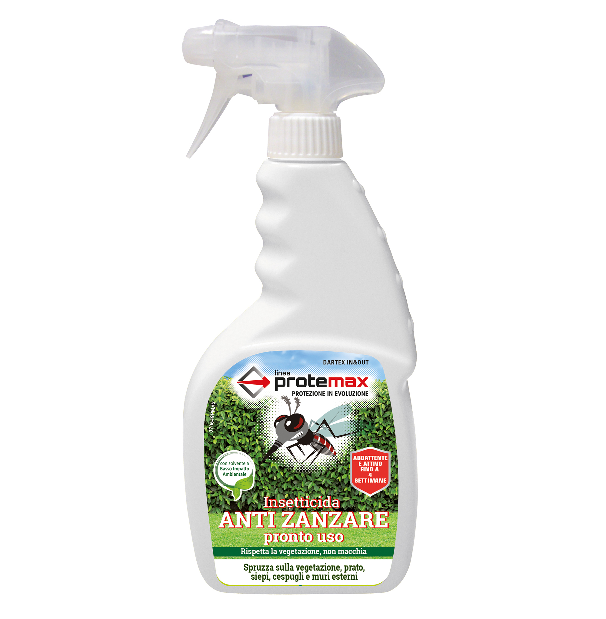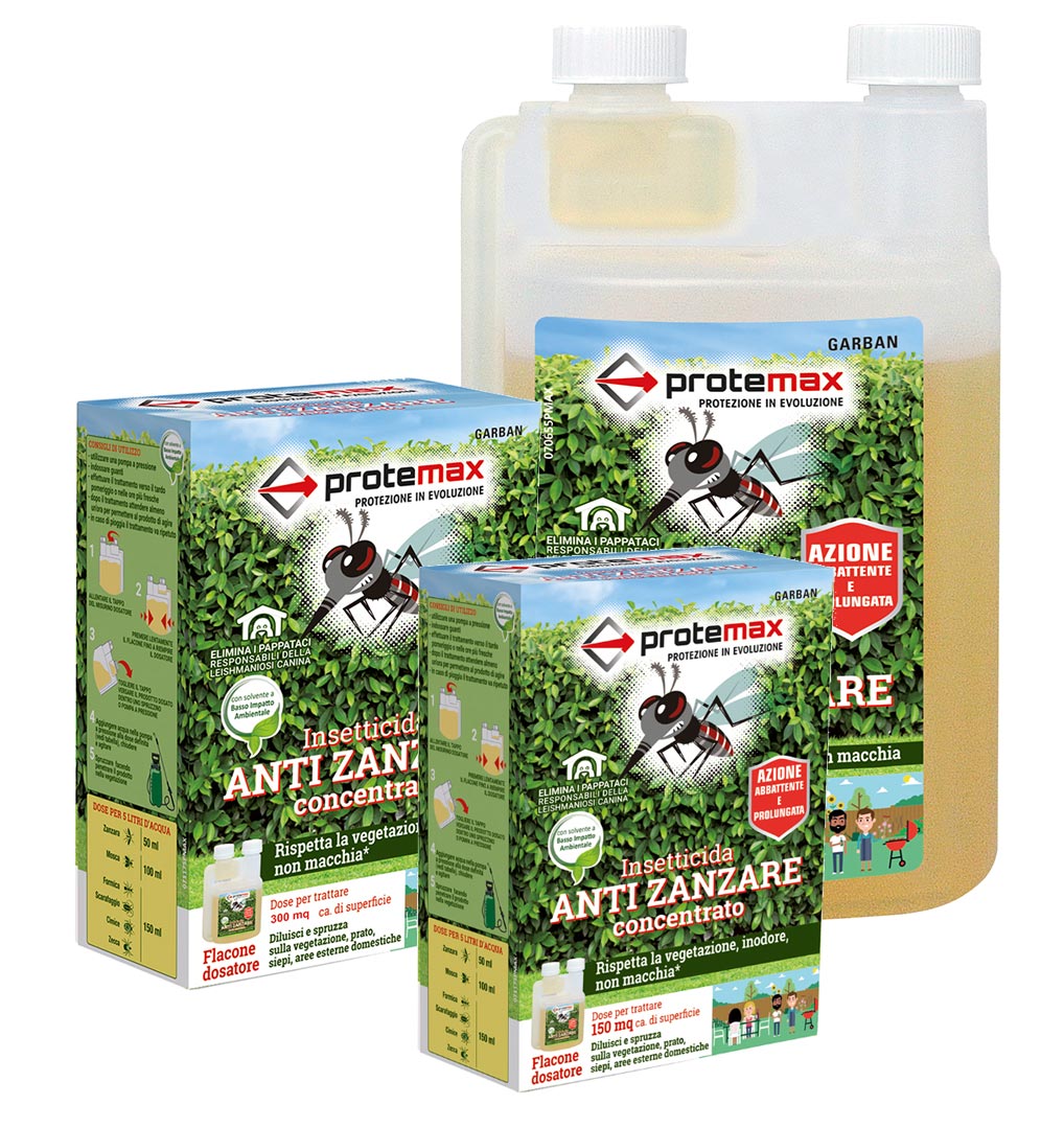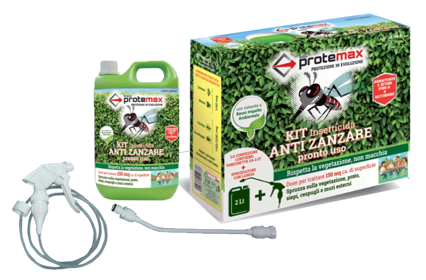 In presenza di spazi verdi, e infestazioni gravi di zanzare, la soluzione è invece Protemax Insetticida Concentrato, da diluire e spruzzare sul prato, piante ornamentali, muri perimetrali, efficace contro le zanzare tigre, i pappataci e altri insetti.