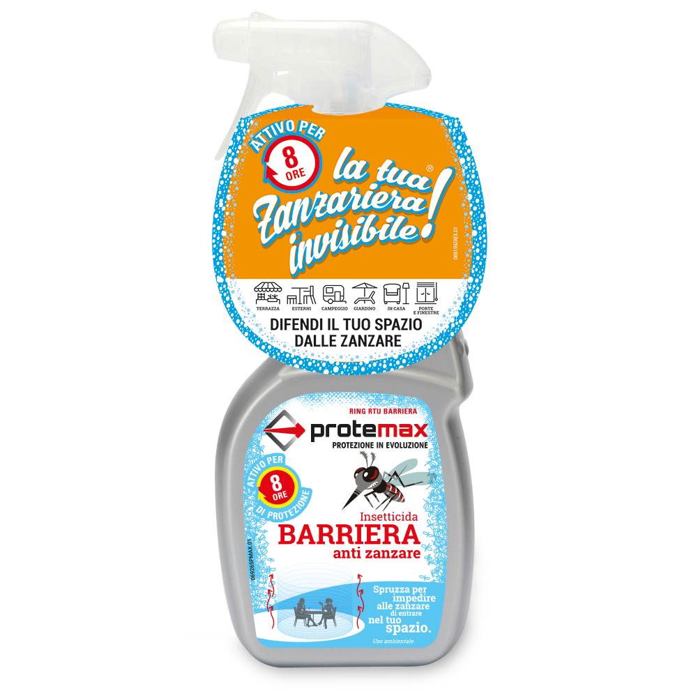 Protemax Barriera crea una zanzariera invisibile, da attivare semplicemente spruzzando il prodotto nell’ambiente intorno allo spazio da difendere (il portico, in giardino, sui davanzali, sulle porte), in modo che la sostanza contenuta (transflutrina) si attivi immediatamente evaporando in modo costante e duraturo per 8 ore.