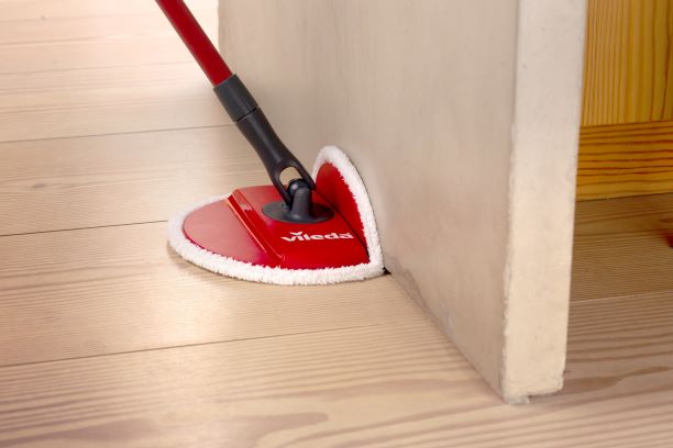 La piastra piatta rotonda dotata di aletta laterale pieghevole e snodo a 360° rende Vileda Spin&Clean ideale per una pulizia pratica ed efficace dei battiscopa e per raggiungere facilmente anche i punti più difficili della casa, come gli angoli o sotto i mobili.