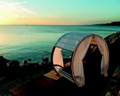 La struttura si compone di 2 sdraio Saigon con sistema di regolazione dell’inclinazione, 1 set di tende (4 pz) con sistema di fissaggio a bottoni, 1 copertura in PVC Soltis con sistema di fissaggio a velcro cm 240x162x219h. Fall in love è disponibile naturale e in 6 colori.