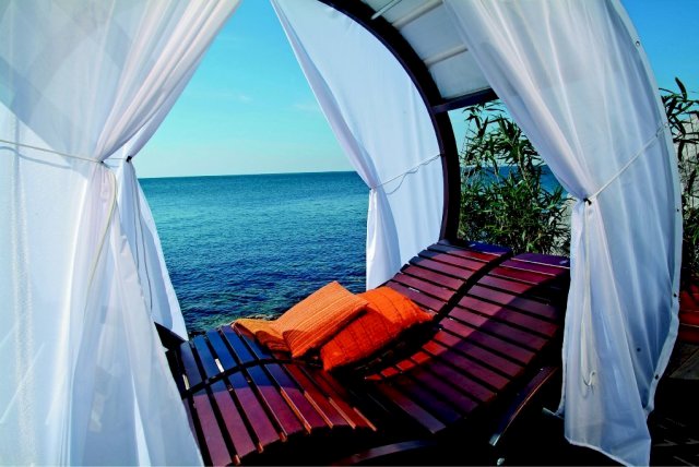 Pircher propone Fall in love, una struttura in lamellare dalla doppia funzione: proteggere dal sole e assicurare comodità e relax.