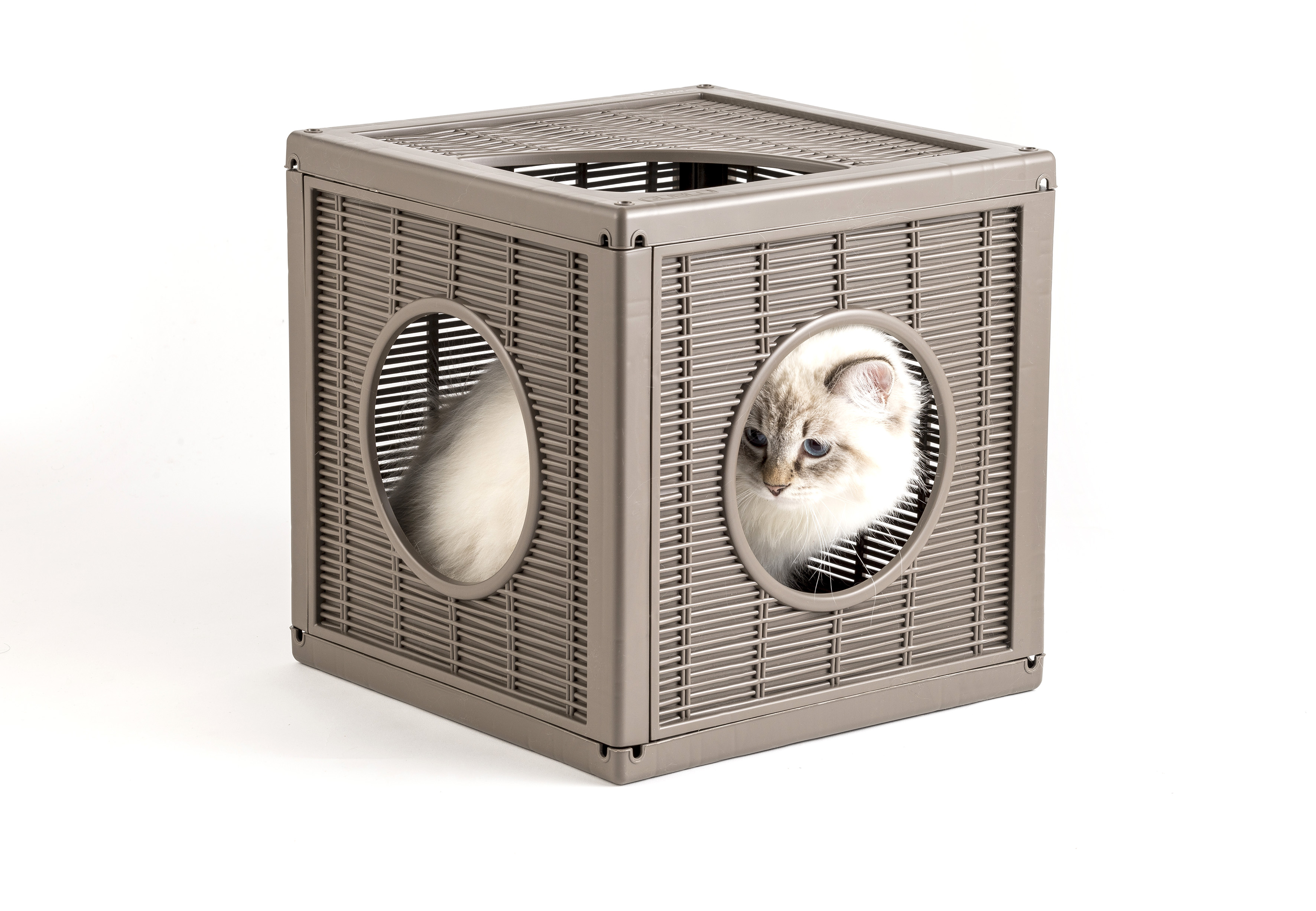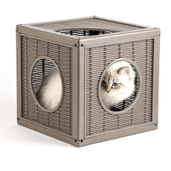 Bamapet ha ideato Qublo, il gioco/cuccia componibile e modulare, a forma di cubo dalle dimensioni 35x35, perfetto all’esterno come all’interno di casa, disponibile nelle nuance ghiaccio e tortora, ideale anche come complemento di arredo. I moduli sono stati pensati per essere impilati e affiancati ottenendo così infinite combinazioni di percorsi saliscendi, nei quali, grazie alla trama similpaglia, l’animale vede fuori sentendosi al sicuro. Qublo è dotato di oblò su due lati adiacenti e di una terza apertura posta sull’angolo che li collega, che permettono al gatto di spostarsi comodamente da un cubo all’altro. Realizzato in resina termoplastica atossica e riciclabile, resiste, non si scheggia, è lavabile.