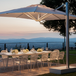 Il dimensionamento e i leveraggi realizzati permettono all'ombrellone di chiudersi agevolmente senza la necessità di dover spostare tavoli, oltre alla possibilità di ruotarlo sul piano orizzontale.