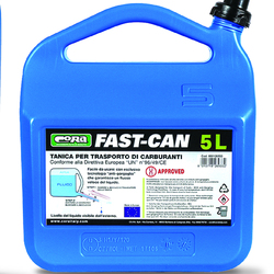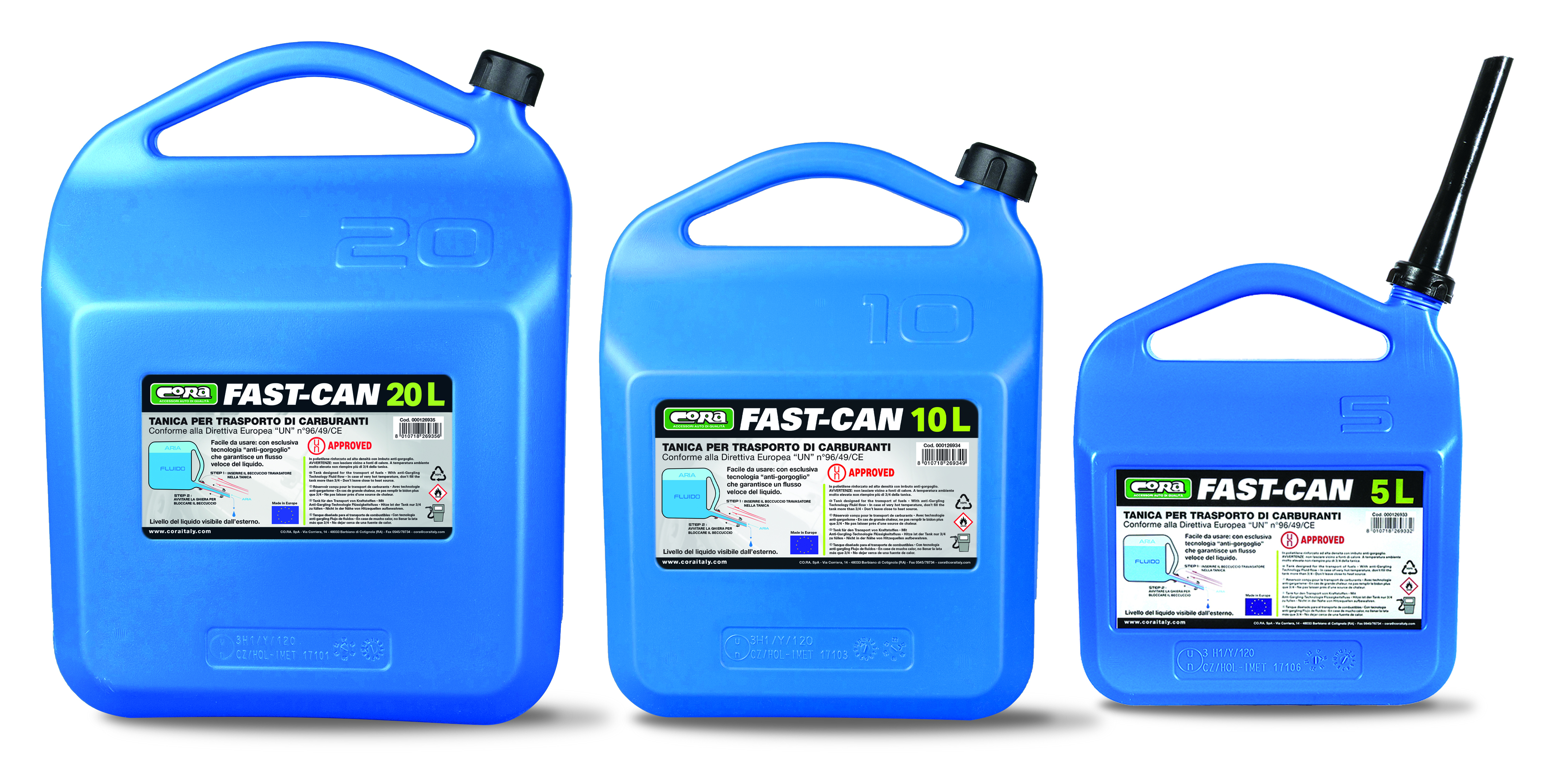 L'esclusiva tecnologia "anti-gorgoglio" consente un flusso del liquido veloce e continuo con tempi di svuotamento nettamente più veloci rispetto alle altre taniche attualmente presenti sul mercato (per esempio, se confrontata con una tanica Co.Ra. tradizionale di pari capacità, la Fast-Can 5 litri si svuota 25” più velocemente). L'esclusivo design con pratici alloggiamenti per gli accessori permette un rimessaggio pratico e poco ingombrante mentre l’apposito indicatore rende visibile il liquido dall'esterno.