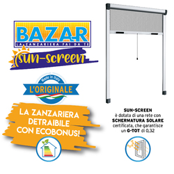 Bazar Sun-Screen garantisce un’adeguata schermatura solare e protezione dall’irraggiamento se correttamente abbinata a una vetrata di tipo C. Il “G TOT” (fattore solare della combinazione vetro e schermatura solare) della rete di questa zanzariera è infatti di 0,32 certificato, inferiore quindi a 0,35 come richiesto dalla normativa. Può quindi beneficiare della detrazione fiscale prevista dal piano Ecobonus 2021.