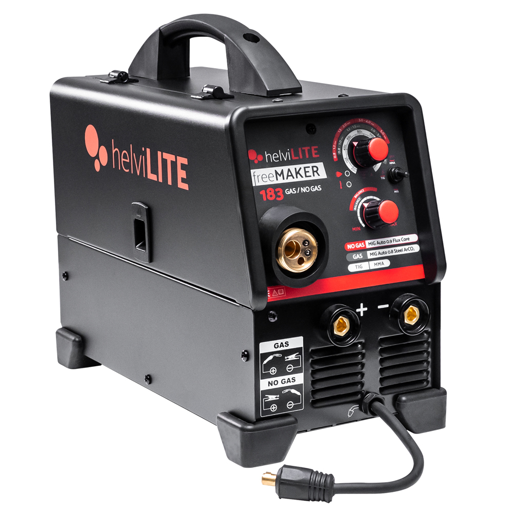 Con la la nuova freeMAKER 183 a marchio helviLITE® è sufficiente una sola saldatrice per fare tutto: salda a filo (con gas o senza), ad elettrodo e a TIG. Compatta e leggera con un ottimo ciclo di lavoro (150 Amp al 25%).