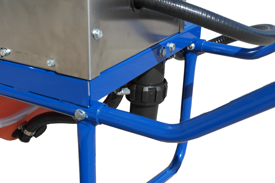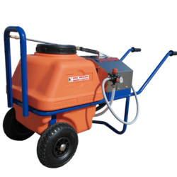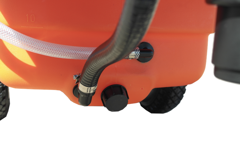 Il pratico serbatoio dalla capacità di 60 litri con due ruote a baricentro basso, stabili in tutti i terreni è stato equipaggiato con un modulo rivestito da un cofano di acciaio inox che contiene una Pompa a membrana elettrica da 6,9 bar e 3,79 litri/minuto.