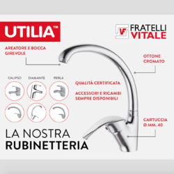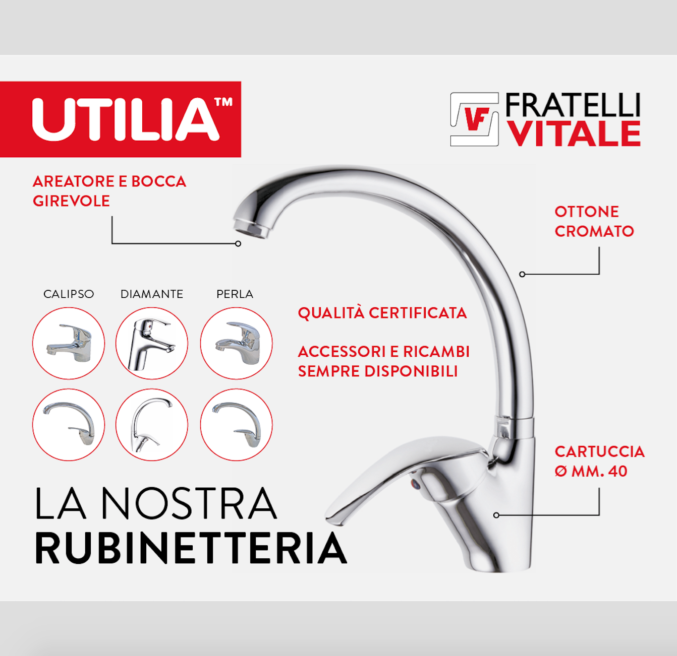 Tutti i modelli in catalogo presentano una leva monocomando per regolare l’erogazione. Inoltre, sono disponibili cartucce di ricambio in ceramica da 40 mm per la manutenzione. Ciascun prodotto Utilia è frutto di accurati test effettuati in laboratorio che consentono di certificarne la qualità e garantire maggiore sicurezza al consumatore finale.