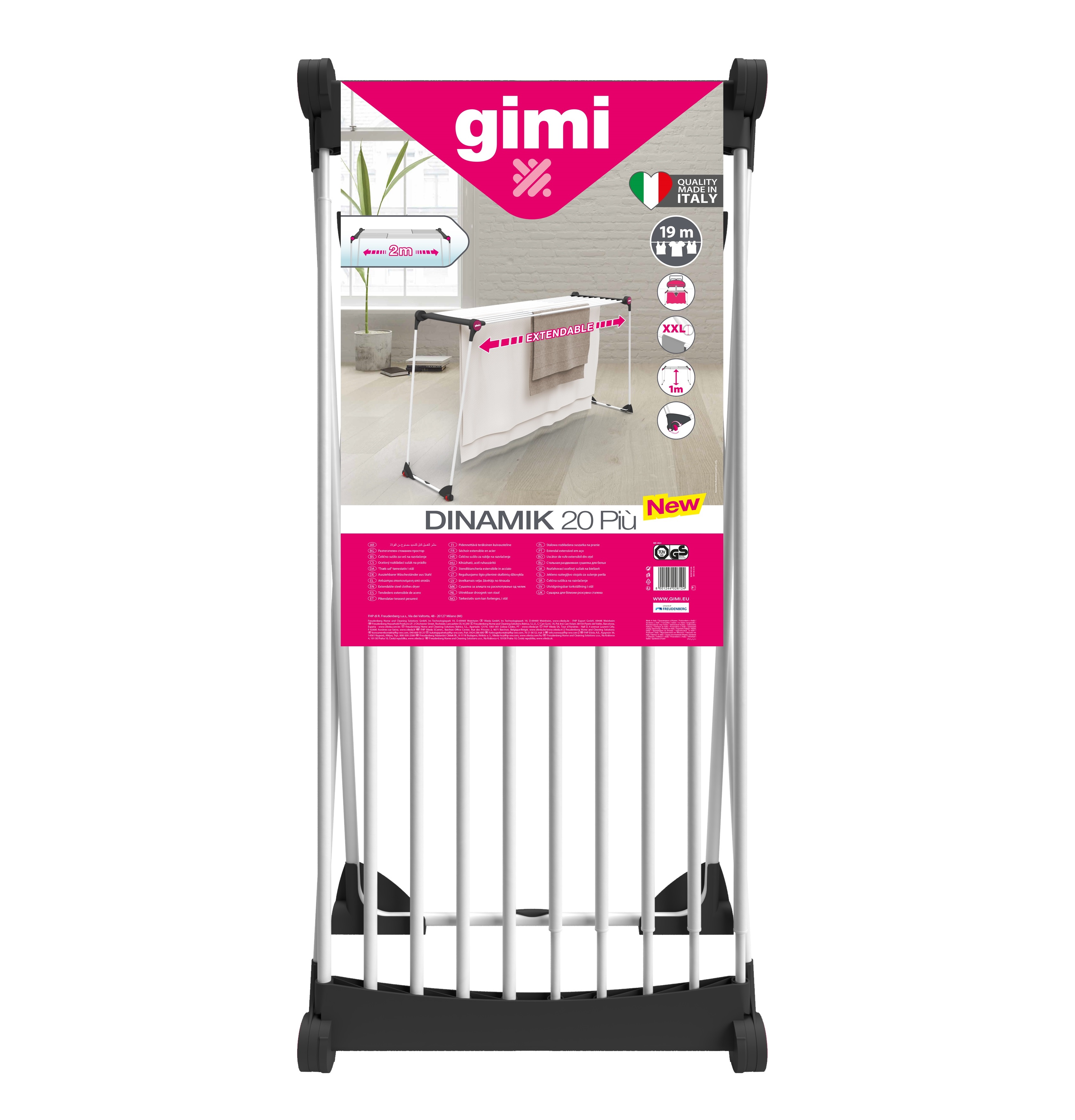 Due le varianti disponibili, Dinamik 20 Più (in foto) e Dinamik 30 Più: stendibiancheria in acciaio, con griglia centrale telescopica, estensibile da 117 fino a 205 cm, e progettata con fili tubolari molto spessi che non segnano il bucato.