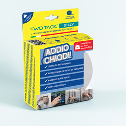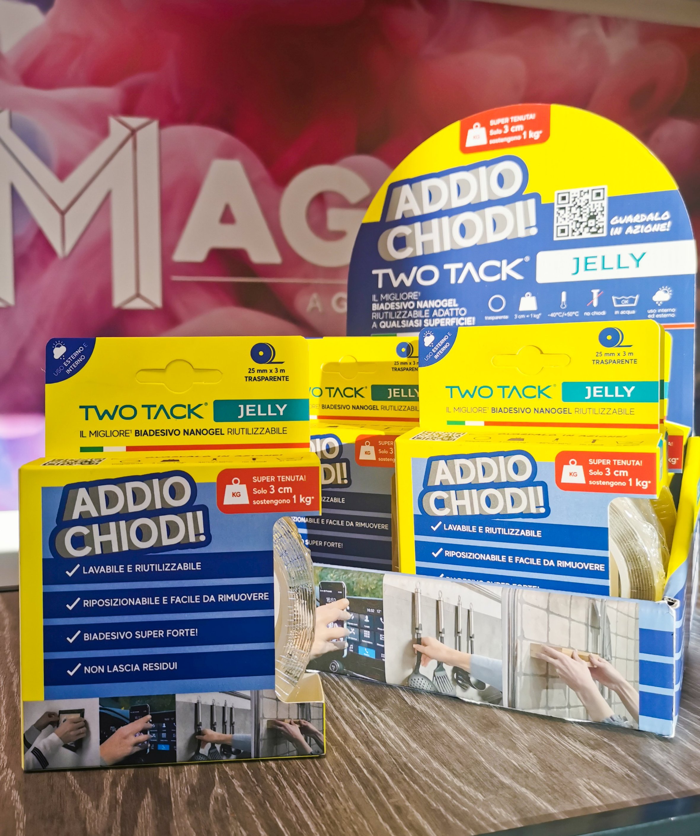 Two Tack® Jelly di Mister Magnus è lo speciale nastro biadesivo trasparente senza colla. Grazie alle sue potenti microventose con tecnologia Nano-Tack, è caratterizzato da alta adesività ed estrema tenacia, ma non rovina le superfici e può essere riutilizzato. Bastano solo 3 cm di nastro per sostenere oggetti fino a 1 kg di peso. È utilizzabile su qualsiasi superficie, liscia o irregolare, anche le più delicate come legno, vetro, gres, ceramica. L’assenza di colla ne assicura la rimozione senza lasciare residui. Ideale sia per applicazioni indoor sia outdoor, Two Tack® Jelly resiste anche all’acqua senza perdere il suo potere incollante.