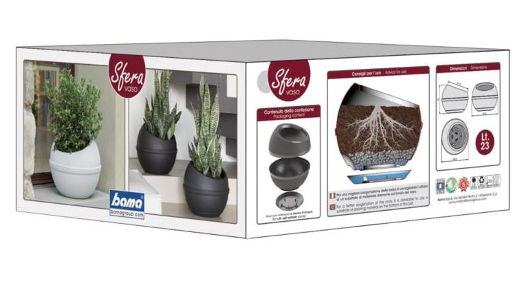 Sfera è il vaso dal sapore rustico moderno, caratterizzato dalla finitura simil pietra che lo rende ideale non solo all'esterno, ma anche in ambienti interni arredati in stile sobrio e lineare. Sfera è versatile, elegante e capiente (Lt.23), dotato di sottovaso con riserva d’acqua e disponibile nei colori: ghiaccio, antracite e cappuccino. Realizzato con materiale vergine, 100% riciclabile e addizionato di anti UV per resistere ai raggi solari e all'invecchiamento. Proposto in un robusto e colorato packaging in cartone, per garantire una maggiore protezione nelle fasi di trasporto e una migliore e più immediata comunicazione al consumatore. Dimensioni disponibili: D.40,5X32h.