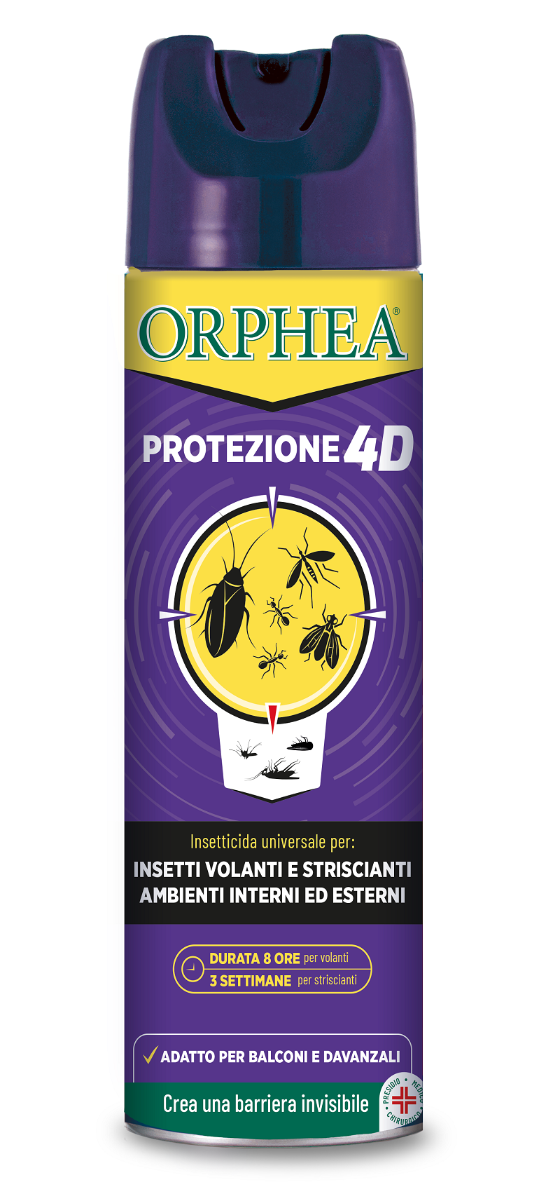 Orphea Insetticida Multinsetto Protezione 4D: dal pack “total violet”, l’insetticida universale adatto per gli ambienti esterni e interni della casa, protegge dagli insetti volanti con un’efficacia di 8 ore e da quelli striscianti per 3 settimane.
