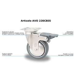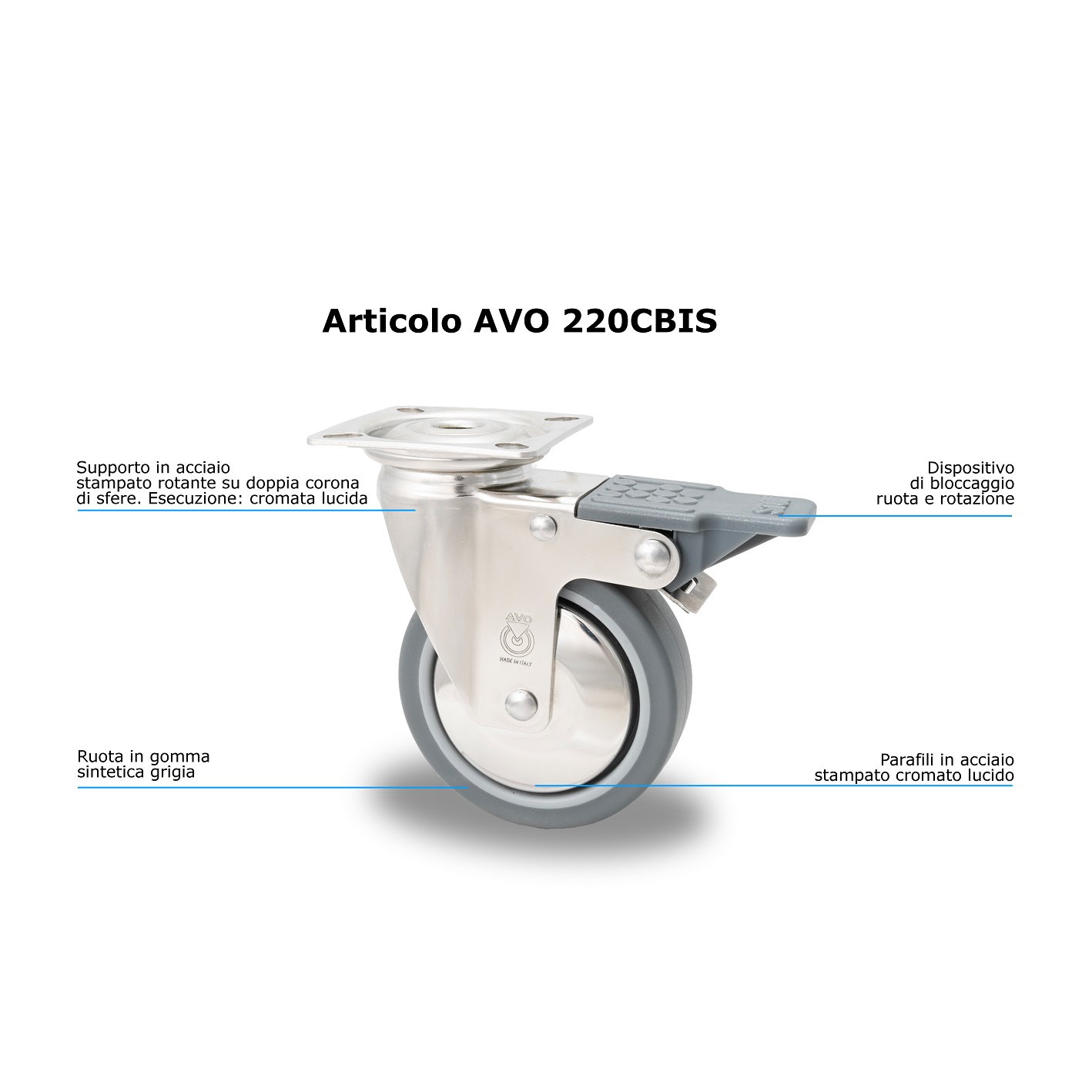 Da catalogo AVO, la Serie 220C: esecuzione cromata lucida. Supporto in acciaio stampato rotante su doppia corona di sfere. Ruota in gomma sintetica grigia antitraccia flangiata in termoplastico con parafili in acciaio stampato. Disponibile dal diametro 40 al 125 mm. L’impiego è consigliato sia nel campo dell’arredamento sia in quello professionale e industriale.